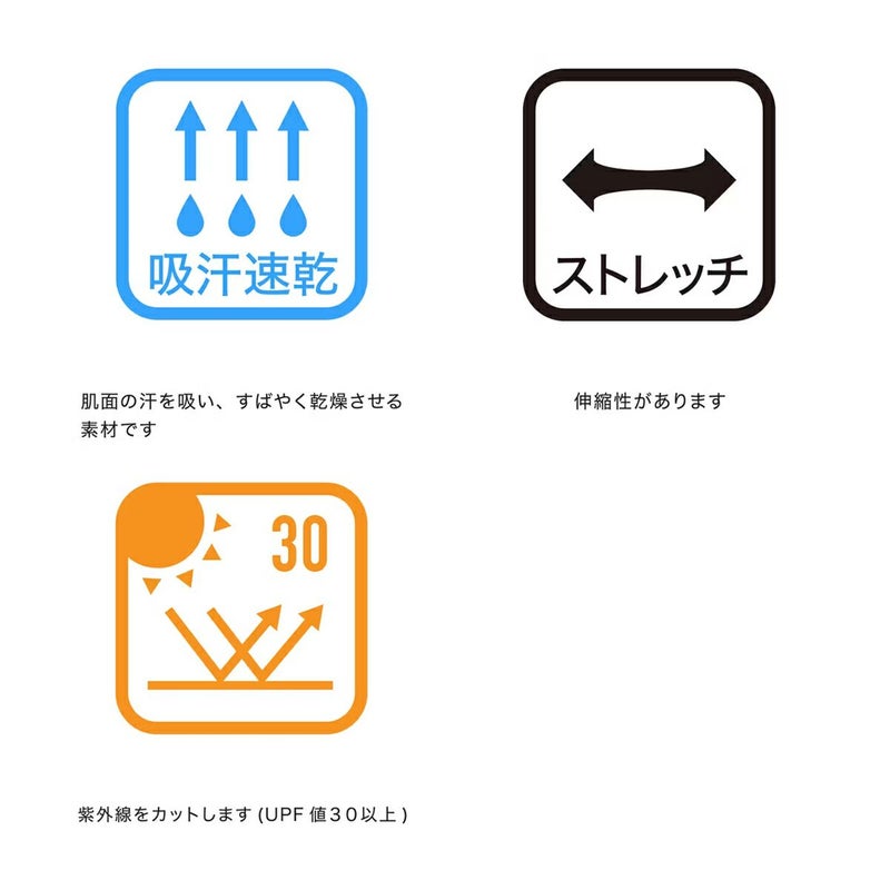吸汗速乾、ストレッチ、UV CUT(UPF30)。