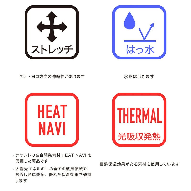 HEAT NAVI、2WAYストレッチ、はっ水、光吸収発熱。