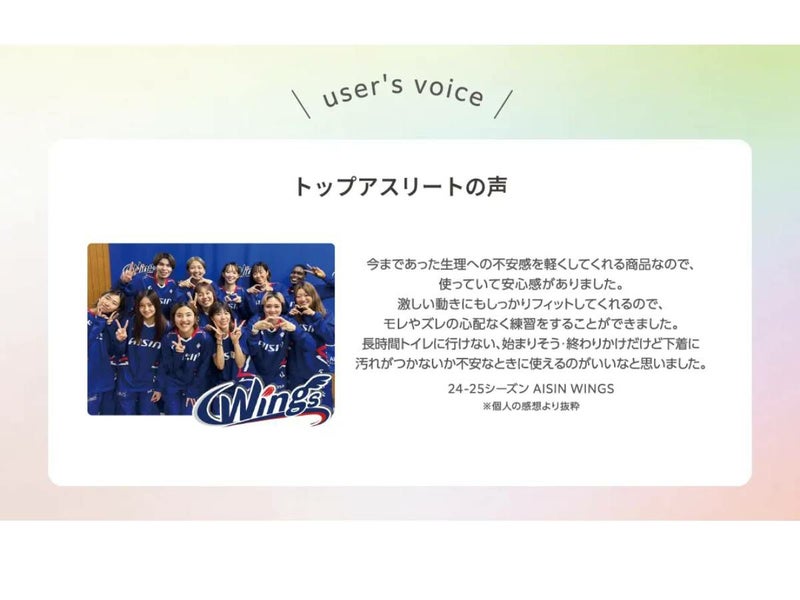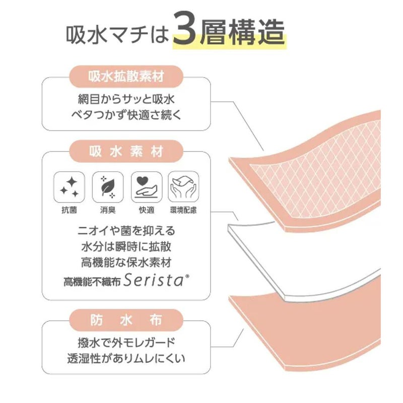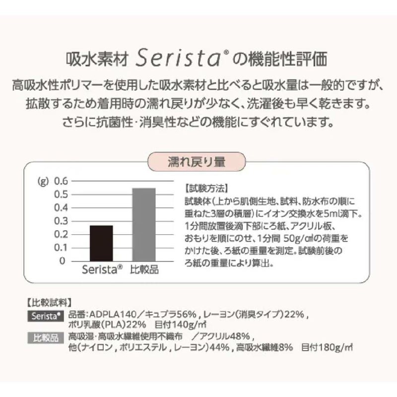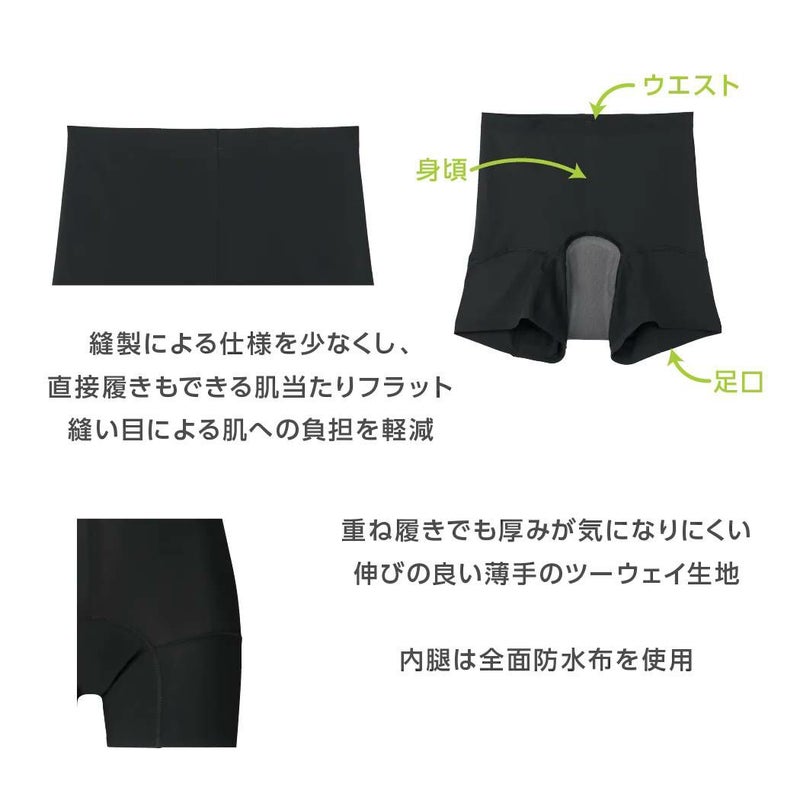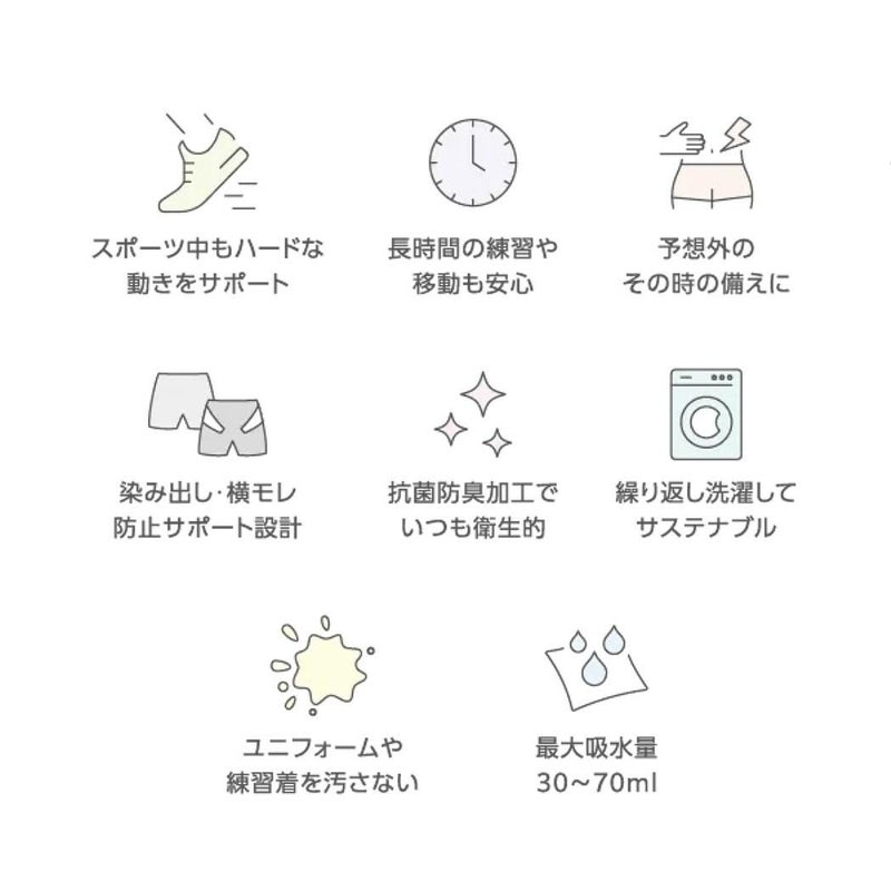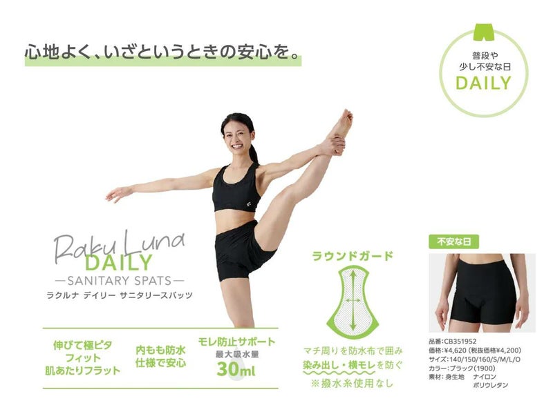 ラクルナ デイリー サニタリースパッツ/女性アスリートのパフォーマンスをサポートする吸水スパッツを開発。吸水性のある3層構造のマチ部と内もも防水仕様により、不安な日に安心を。体にフィット/ウエスト及び裾口をシームレス仕様にしており、伸縮性のある生地により体にフィットしアウターにひびかない。モレ防止サポート/最大吸水量30ml。マチ周りを防水布で囲み染み出し・返りモレを防ぐ。高機能素材/高機能不織布Seristaにより、ニオイや菌を抑え、水分は瞬時に拡散、高機能な吸水素材。