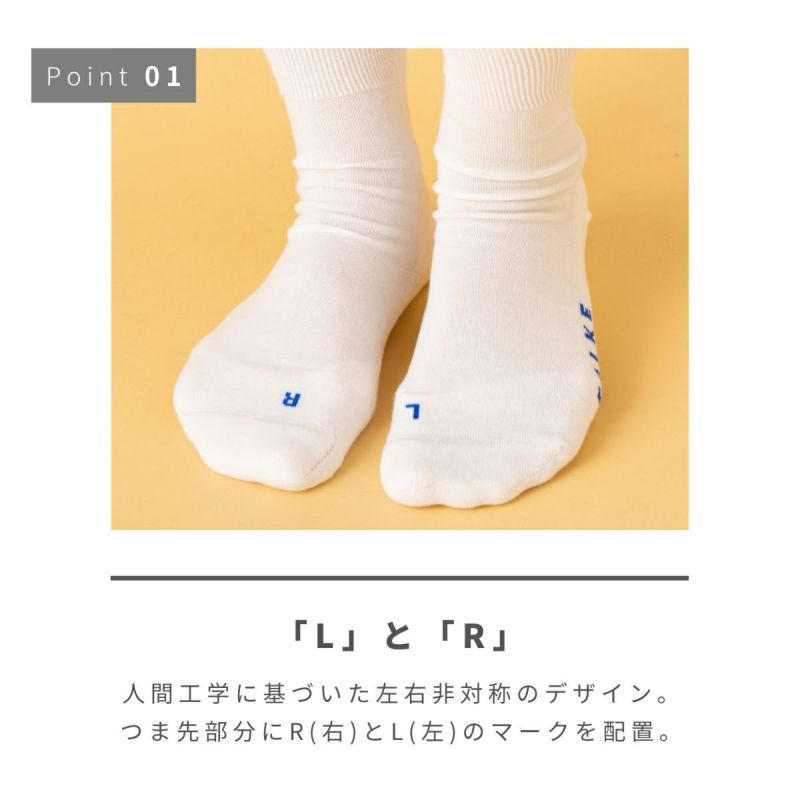 ブランド独自の左右非対称のデザインで、つま先部分にはR(右)・L(左)のマークが入ります。