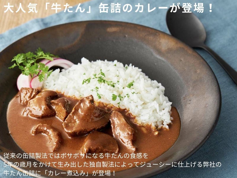 従来の缶詰製法ではボサボサになる牛たんの食感を5年の歳月をかけて生み出した独自製法によってジューシーに仕上げる弊社の牛たん缶詰に「カレー煮込み」が登場です!