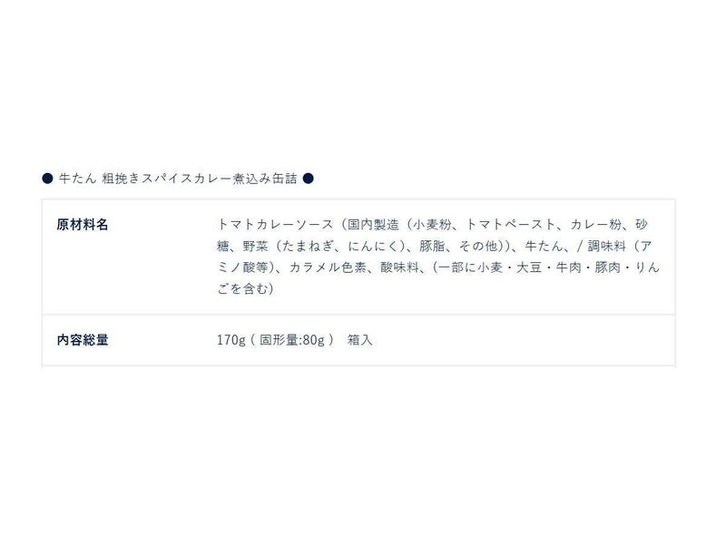 トマトカレーソース(国内製造(小麦粉、トマトペースト、カレー粉、砂糖、野菜(たまねぎ、にんにく)、豚脂、その他))、牛たん、/ 調味料(アミノ酸等)、カラメル色素、酸味料、(一部に小麦・大豆・牛肉・豚肉・りんごを含む)
