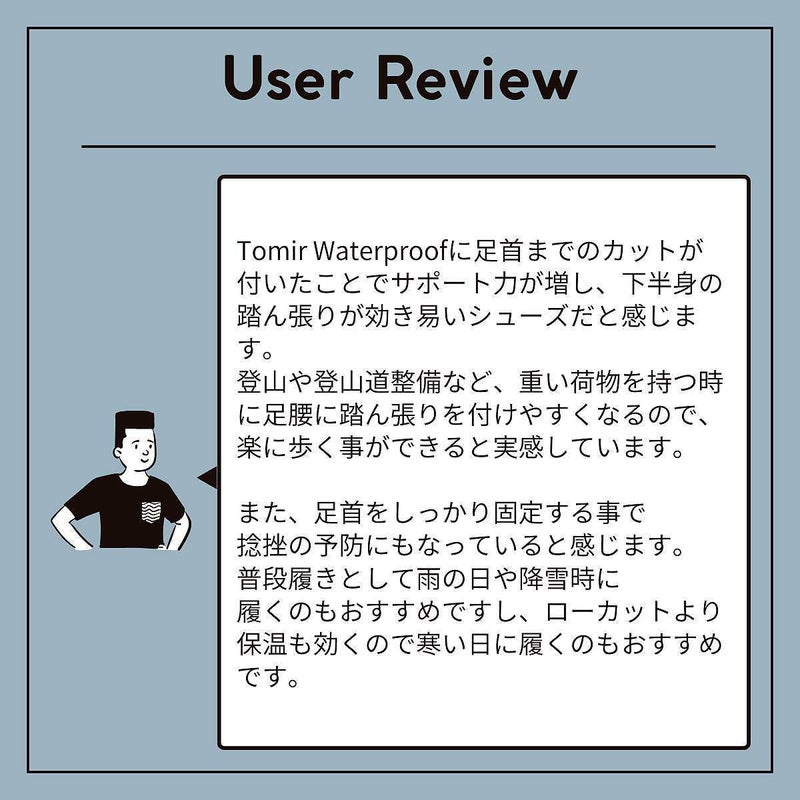 「寒い冬にも、本当に頼りなるシューズです。足は常にドライで快適で、濡れた地形でもしっかりとグリップしてくれます。もしあなたが足首周りのホールド性を心配するのなら、