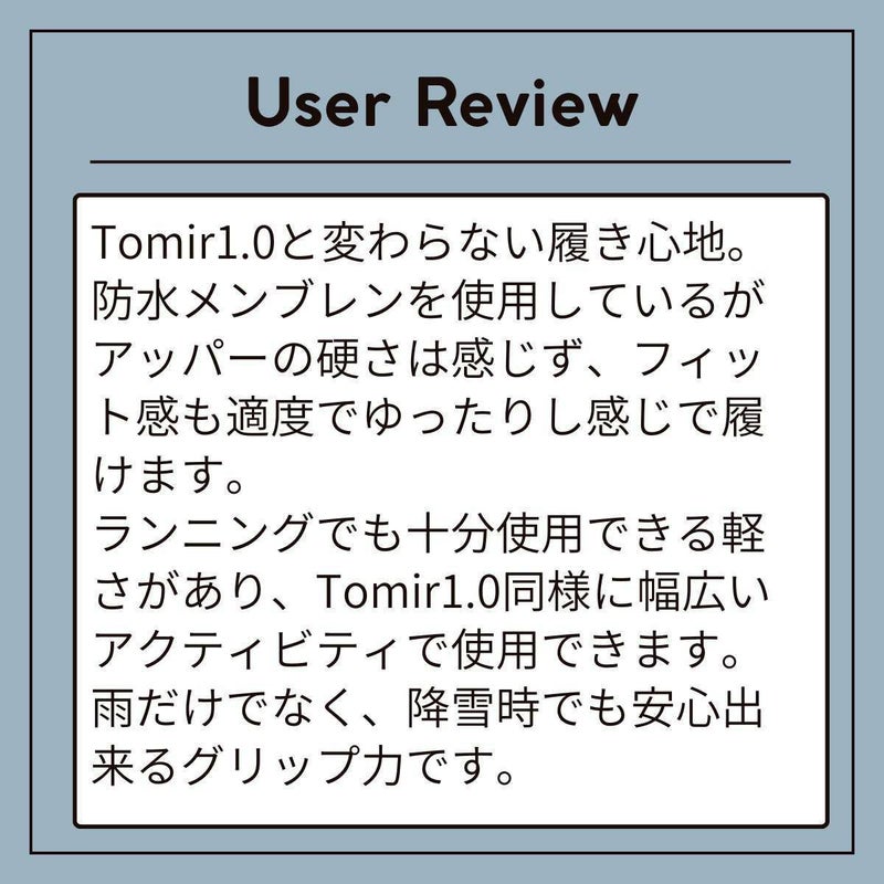 「非常に薄い防水メンブレンにより、トミール シューズとほぼ同じ履き心地ですが、雨、雪、水たまりなど様々なコンディションからしっかりと足を保護します。素晴らしいグリップ性能