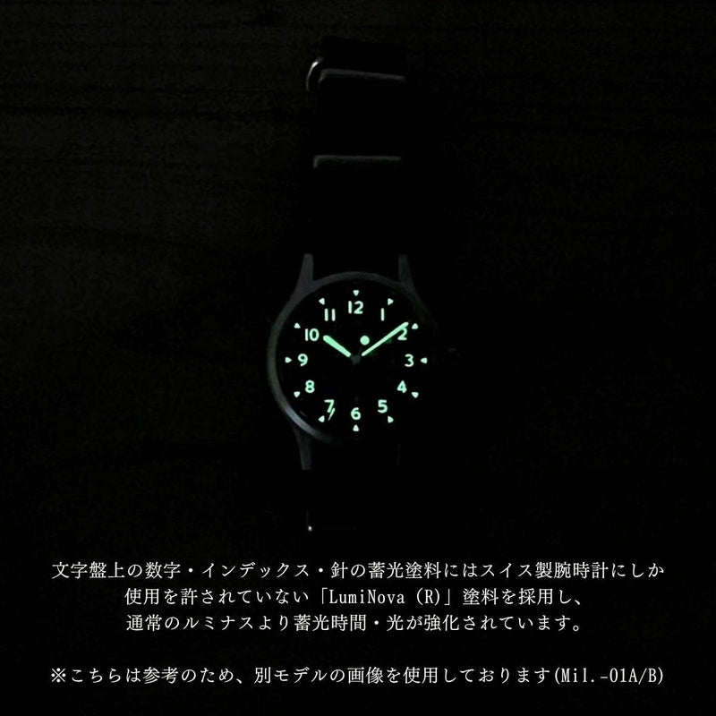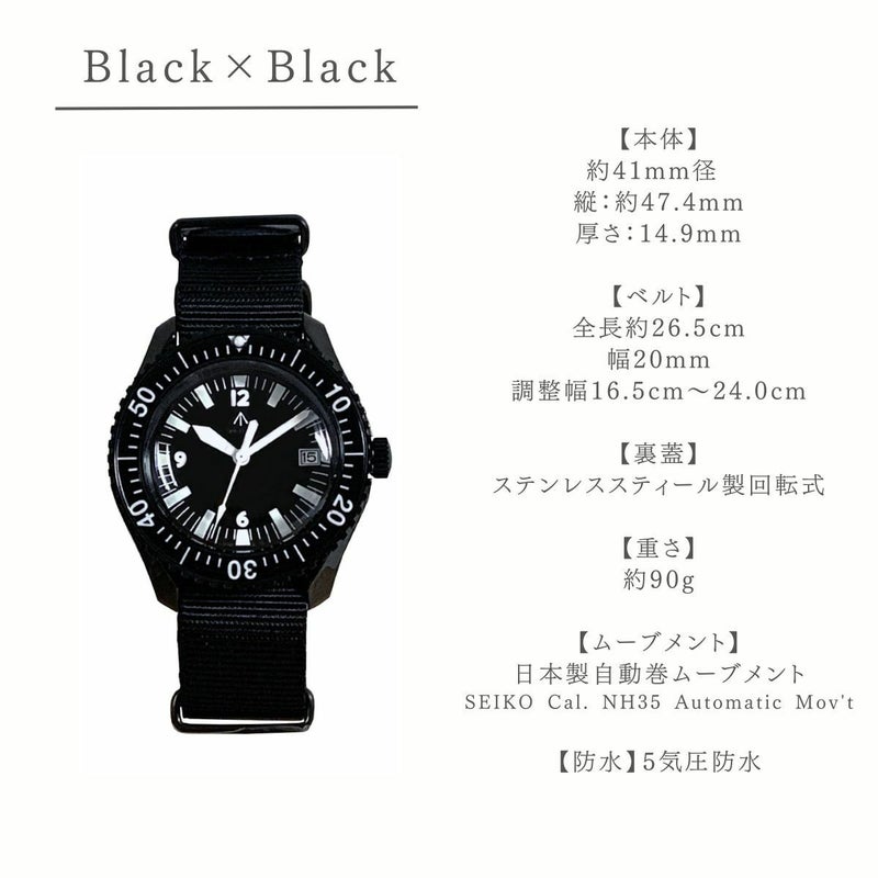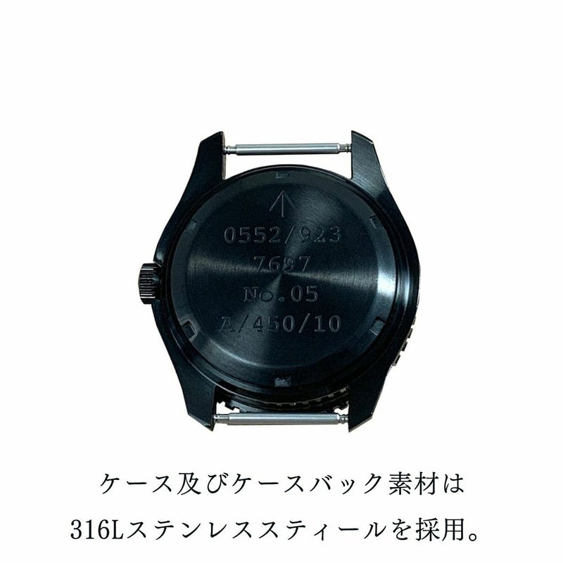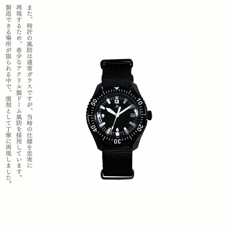 英国海軍ダイバー仕様をベースに、当時のミルスペックを忠実に再現しつつ製作致しました。ケース及びケースバック素材は316Lステンレススティールを採用。ベゼルは当時感を再現するベースに印字した上に樹脂にてカバーする構造に。もちろん現代の機構として逆回転防止機構となっております。風防はアンティーク感を出すためにアクリル製ドーム風防を復刻。日本製オートマチック自動巻ムーブメントを採用し、機能面でも現代の使用に耐えうる製品となってます。文字盤上の数字・インデックス・針の蓄光塗料にはスイス製腕時計にしか使用を許されていない「LumiNova(R)」塗料を採用し、通常のルミナスより蓄光時間・光が強化されています。防水面でも5気圧防水構造ですので日常の水仕事・作業にも充分使用していただけます。