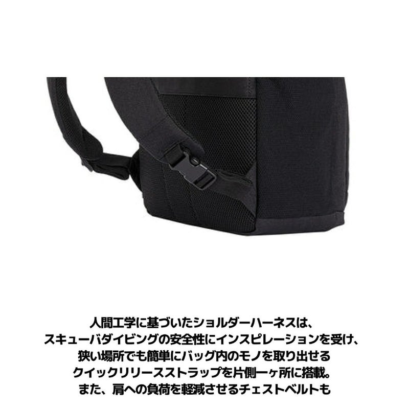 ・人間工学に基づいたショルダーハーネスは、スキューバダイビングの安全性にインスピレーションを受け、狭い場所でも簡単にバッグ内のモノを取り出せるクイックリリースストラップを片側一ヶ所に搭載