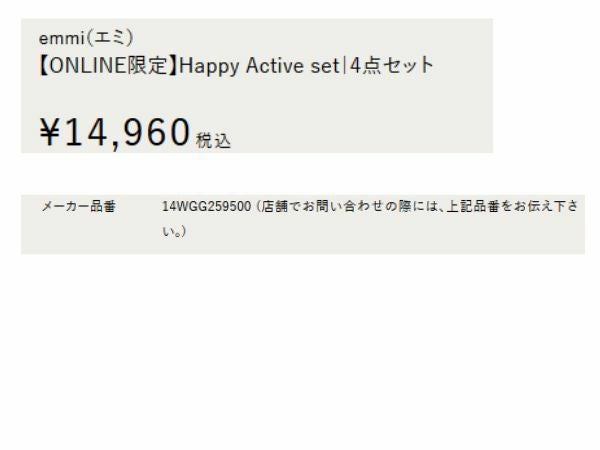 他の画像を見る スポーツ フィットネス スポーツブラ エミ ONLINE限定 Happy Active set ブラトップ・レギンス・ロング袖Tシャツ・トートバッグ 4点セット emmi メーカー希望小売価格 ¥ 14,960 販売価格 ¥ 14,960 税込 在庫切れ 在庫を見る お気に入りに登録する