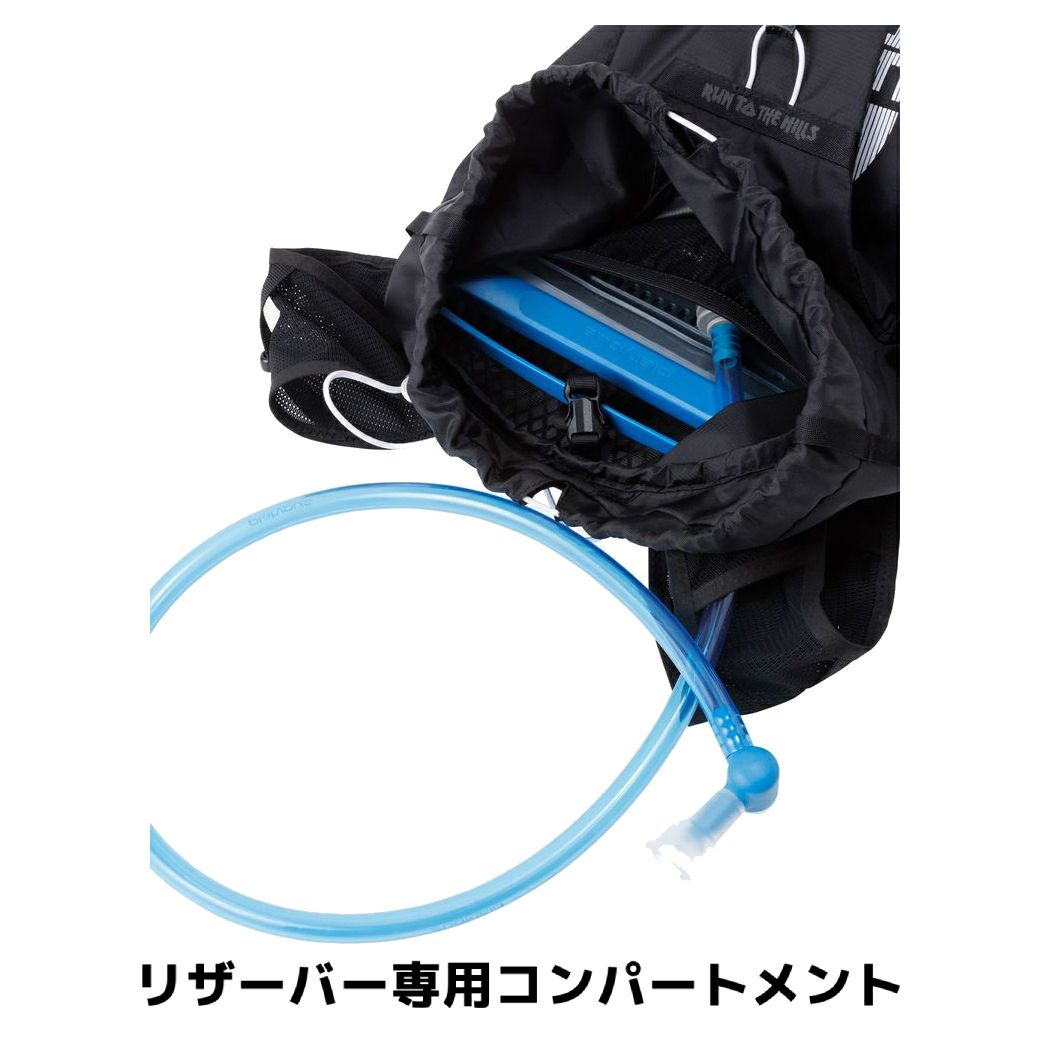 背負ったままでも開閉のできるフラップつきドローコード式メインコンパートメント/容量に応じて位置を調整できるオリジナルボトルつき/本体左側上部にファスナーつきセキュリティポケット/リザーバー専用コンパートメント/ショルダーハーネス部分にゴムスピンドルつきのストレッチポケット/フロント下部左右にストレッチポケット/ホイッスルつきスピンドルコード/高さ調整可能な2本のチェストストラップ/サイドコンプレッションストラップ/リフレクターロゴ/USA企画