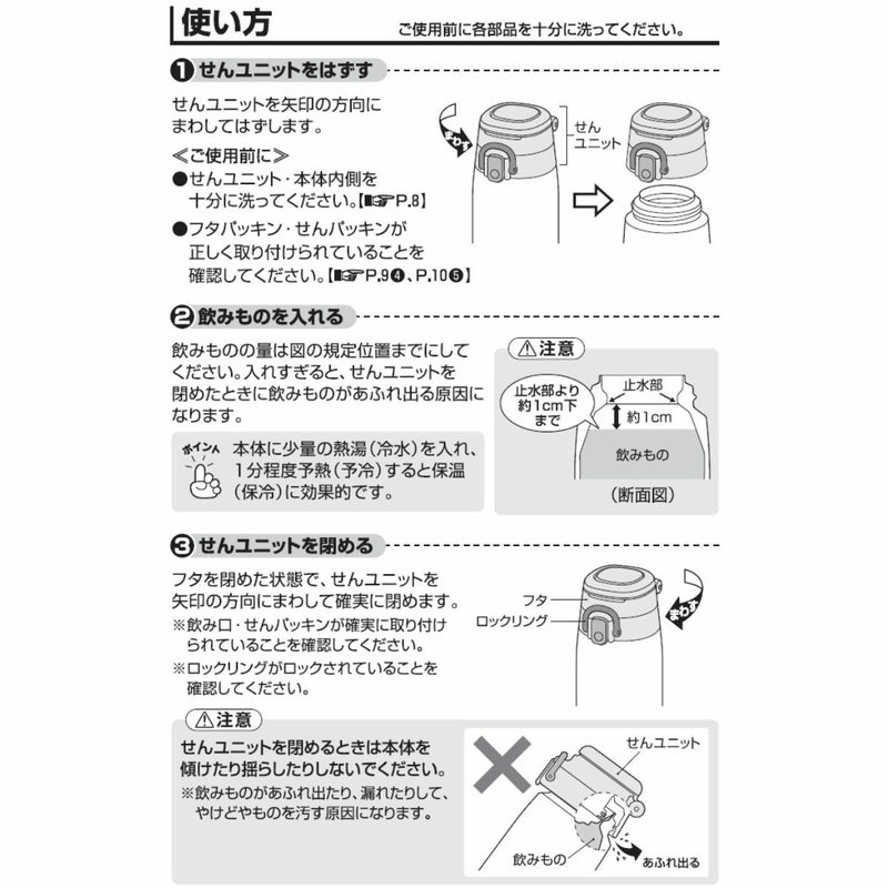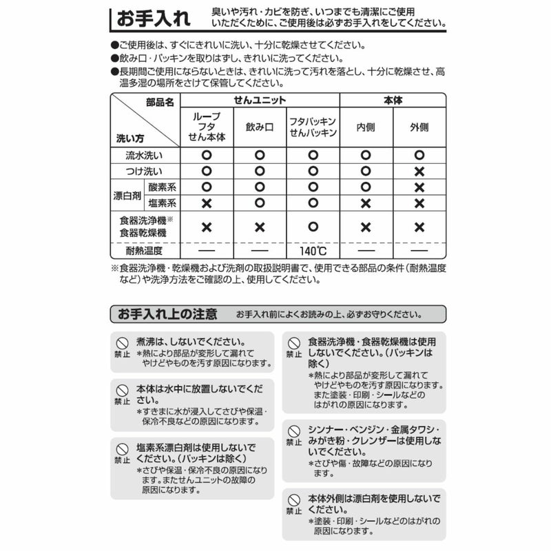 ※保温効力とは、室温20℃±2℃において製品に熱湯をせんユニット下端まで満たし、湯温が95℃±1℃のときからせんユニットを付けて縦置きにした状態で6時間放置した場合におけるその湯の温度です。