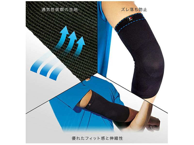 独自のサポートラインでヒジを優しくサポート。薄くかさばらず、肌あたりがよく、快適な装着感を実現。