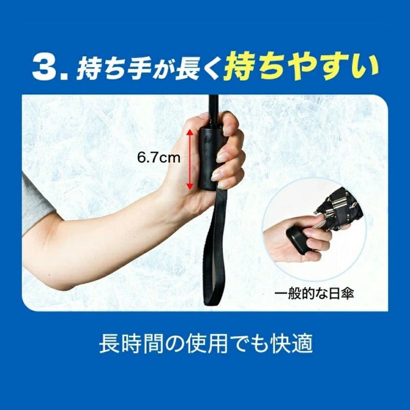 一般的な折り畳み式日傘よりも持ち手が大きく、長時間でも快適にご使用いただけます。