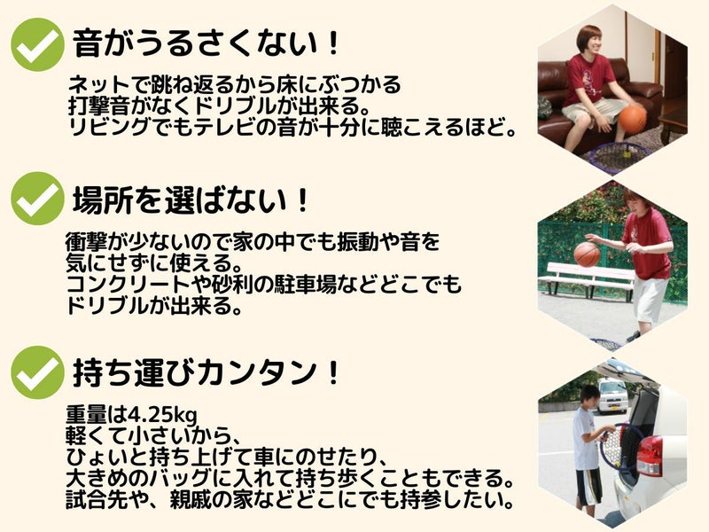 床にぶつかる打撃音がなく、静音でドリブル練習ができる。