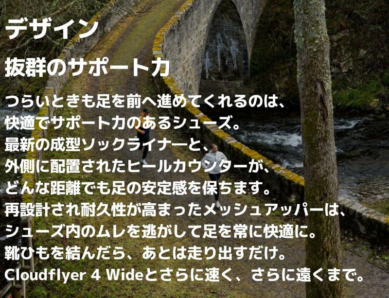 Cloudflyer 4 Wideは高いクッション性とプレミアムな快適さを備えたシューズ。