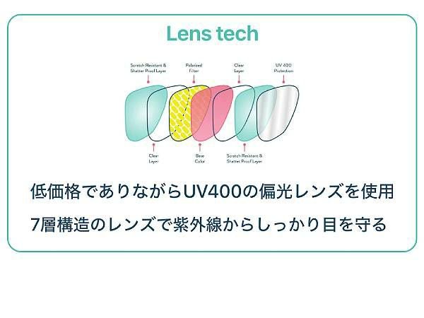 低価格でありながらUV400の偏光レンズを使用、5層構造のレンズで紫外線からしっかり目を守る