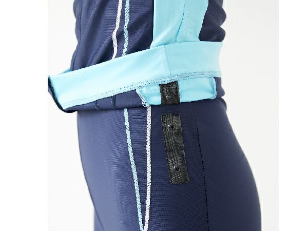 トップはフロントジップ仕様で着脱しやすく、ハイネックがすっきりと見せて
