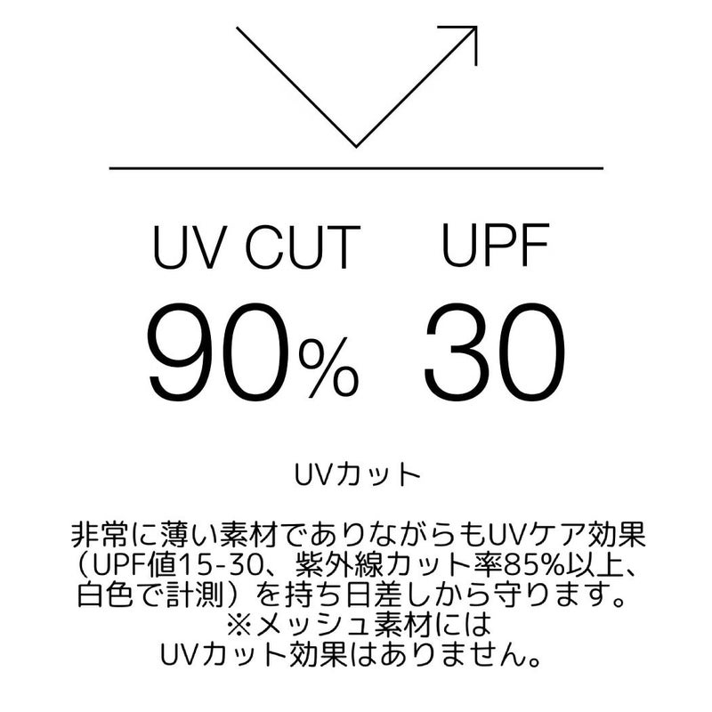 非常に薄い素材でありながらもUVカット(UPF15-30、紫外線カット率85%以上 ※白色で計測)機能付き(※)。