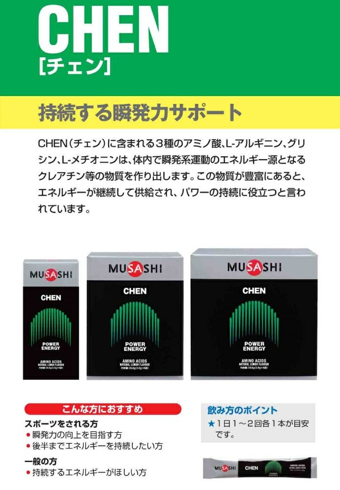 スポーツ トレーニング アミノ酸 ムサシ MUSASHI 【まとめてお得な2セット!】CHEN チェン 8本入り 2セット 1本(3.6g) アミノ酸 サプリ サプリメント スポーツ トレーニング アミノ酸 瞬発力 クレアチン エネルギー クレアチン 人口甘味料不使用 日本製 CHENS