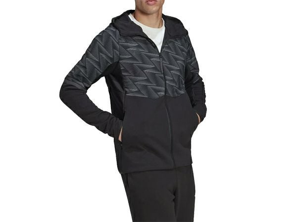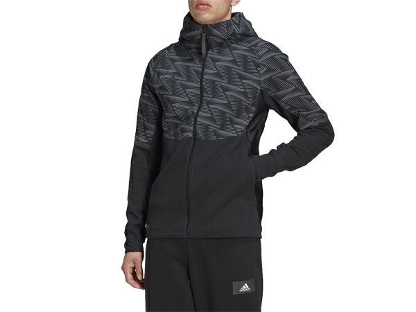 上部AOP、脇と袖下リブ生地・左胸ウーブン素材のフルジップフーディ。