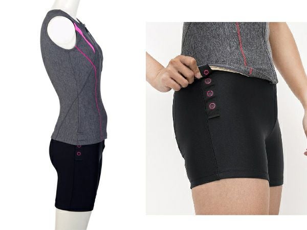 サイドについたカラースナップがトップスとボトムスを繋ぎ止めてくれるため、