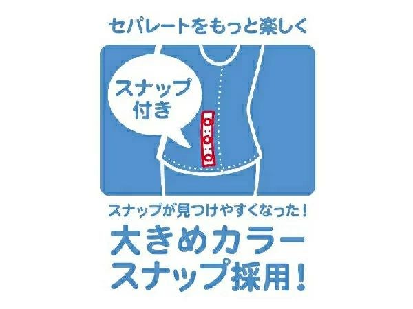 サイドについたカラースナップがトップスとボトムスを繋ぎ止めてくれるため、