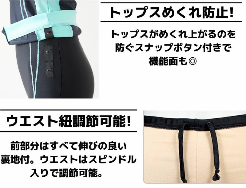 ウエストはスピンドル入りで調節できます。めくれ防止機能付(スナップ付き)。