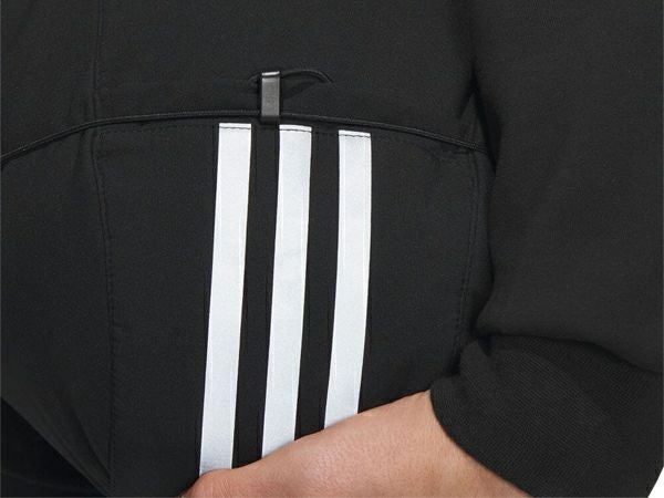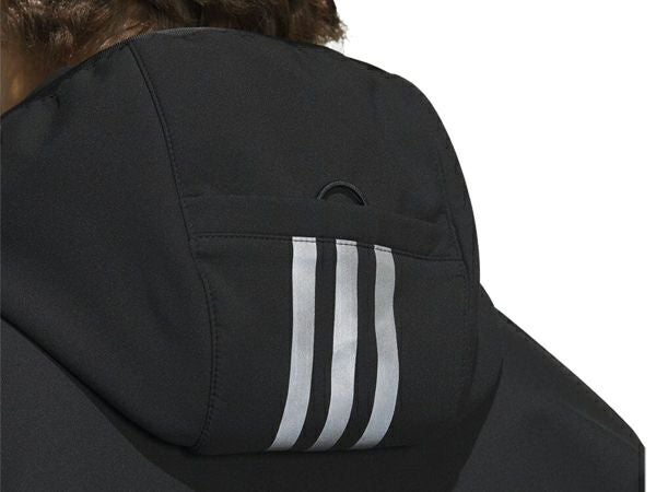 クリーンなテーラードステッチと、フードにあしらったスリーストライプス。