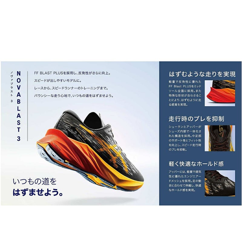 NOVABLAST 3は、クッション性と反発性を兼ね備えたシューズです。レースからトレーニングまでさまざまなシーンで使用可能なシューズです。ミッドソールには新たにFF BLAST PLUSを採用。前作よりも更に厚みをもたせ、クッション性と反発性の向上を追求しました。また前作に比べて大幅な軽量化を実現しつつ、快適性も向上しています。アッパーのシュータンウイング構造が、シューズ内で起こる足の動きを抑え、フィット感を向上させています。またサポート性の高いヒールデザインが加わることで、ランニングの中に足のスムーズな動きをよりサポートします。