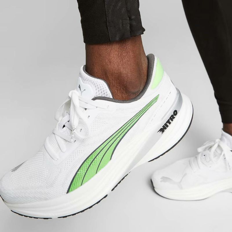 通気性の良いメッシュのアッパーは、足当たりの良いニットを使用。ミッドソールには軽量で窒素を注入したNITRO FORMを採用し、快適さを最優先するロングランに対応します。内側にはPWR TAPEが使用され、サポート性にも優れています。