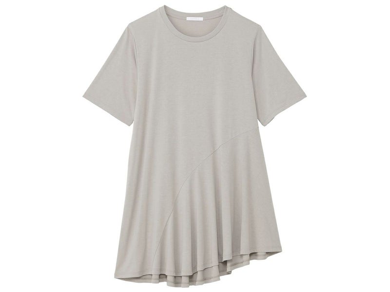 アシンメトリーな切替えとフレアーが女性らしい印象を演出します。