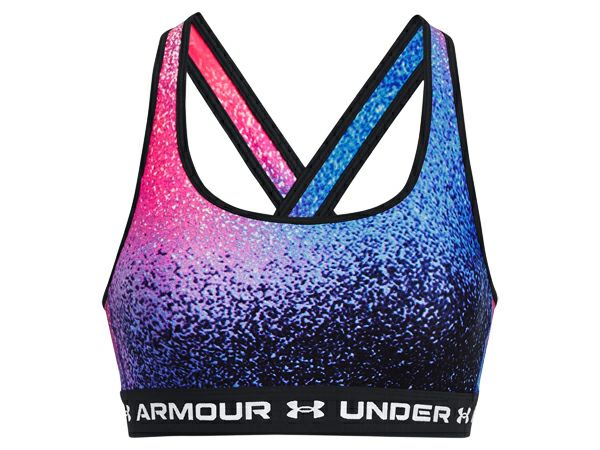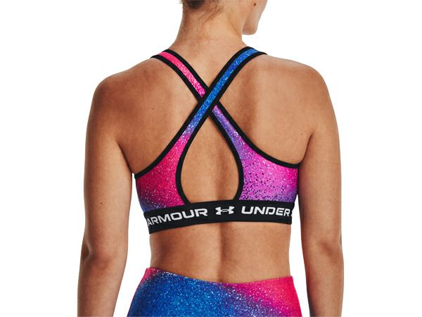 スポーツ フィットネス スポーツブラ アンダーアーマー UNDER ARMOUR クロスバック ブラ ミッド プリント レディース ブルー 青 ピンク 桃色 スポーツ フィットネス インナー ブラトップ 1361042-441