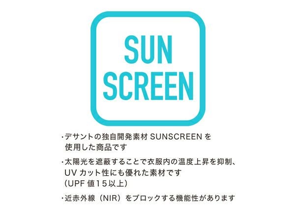 ストレッチ、吸汗、UVカット(UPF50+)、SUNSCREEN。