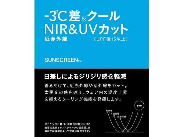 ストレッチ、吸汗、UVカット(UPF50+)、SUNSCREEN。