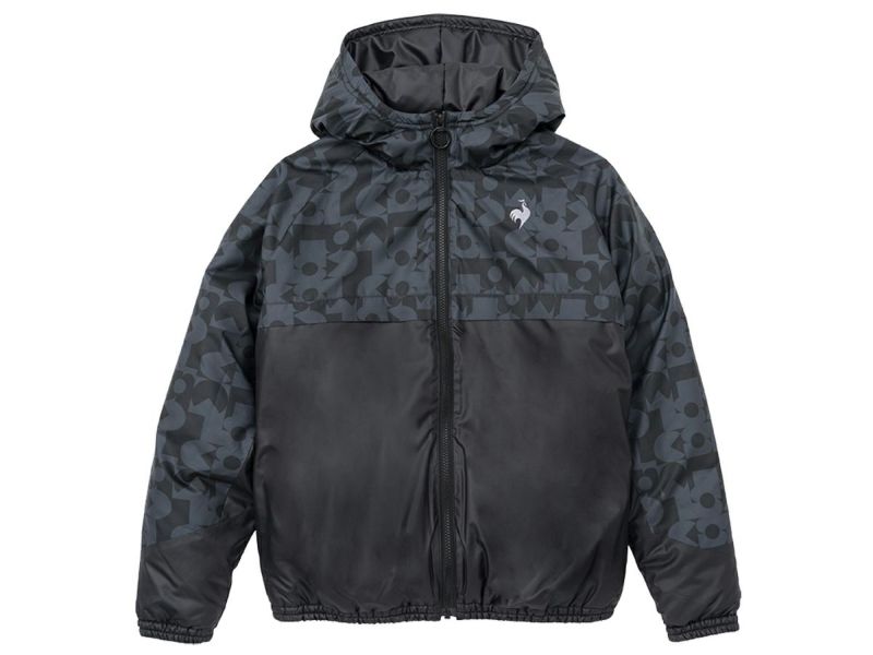 モノグラムのプリントと無地素材を掛け合わせた中わたウィンドジャケット。