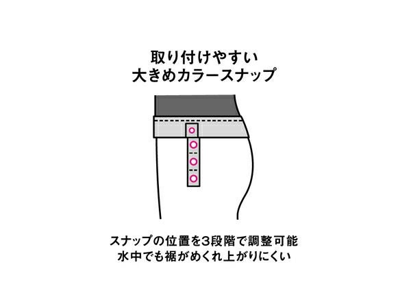 サイドについたカラースナップがトップスとボトムスを繋ぎ止めてくれるため、
