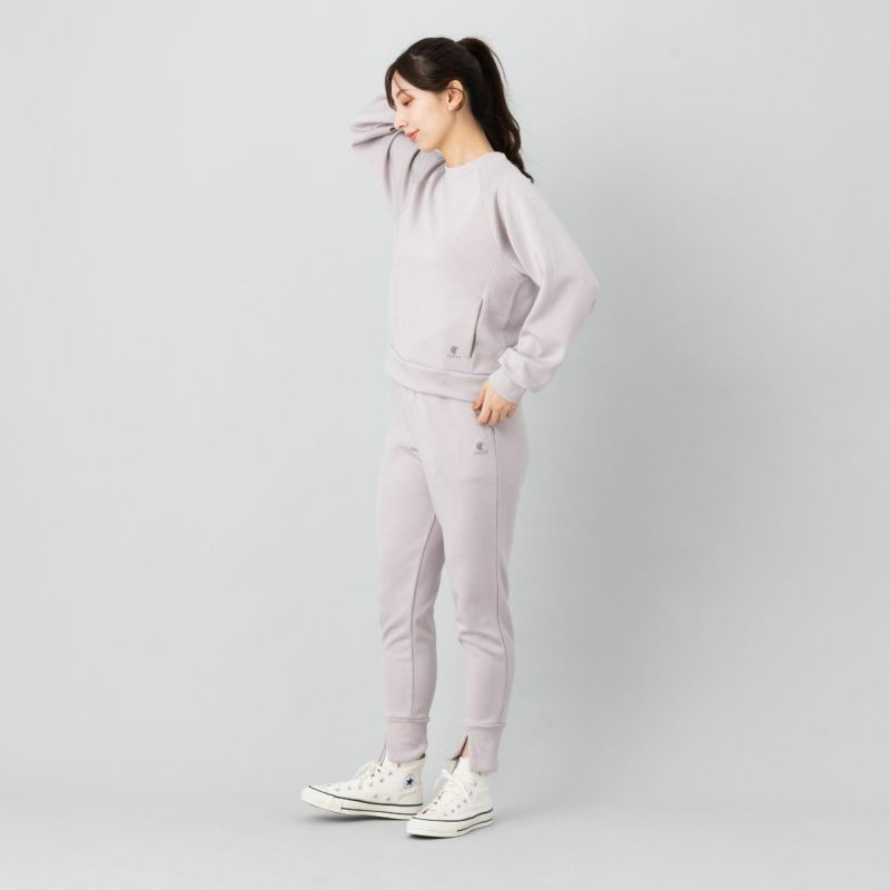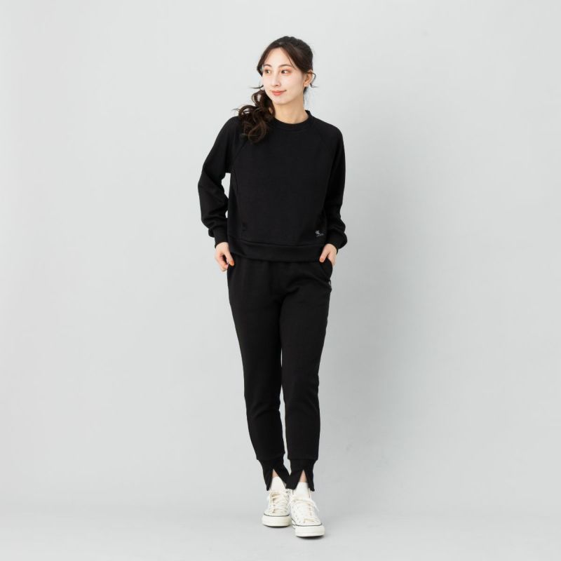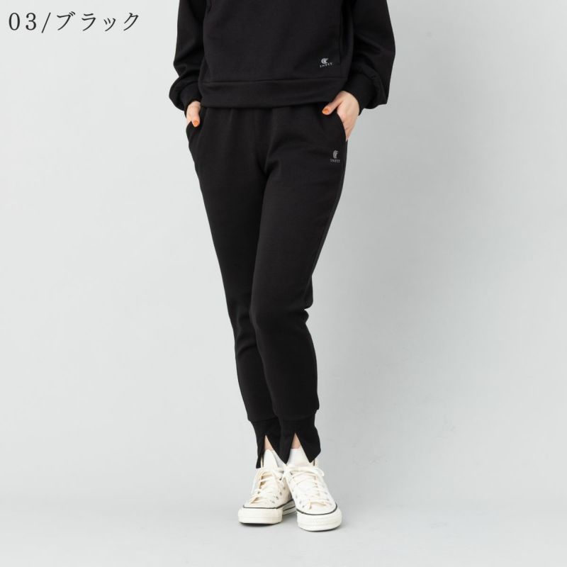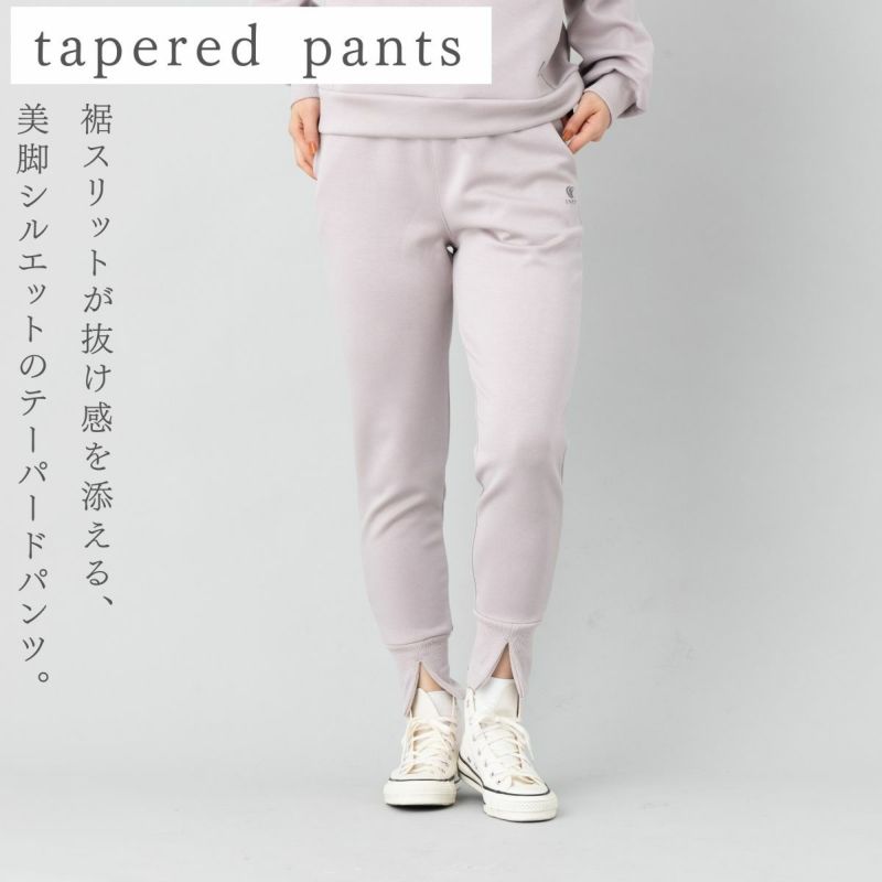 滑らかな表面感と適度な厚みを備えたダンボールスウェット素材を使用し、快適な伸縮性ときれいなシルエットを両立。裾に向かって細くなるテーパードラインが、上品な印象を引き立てます。