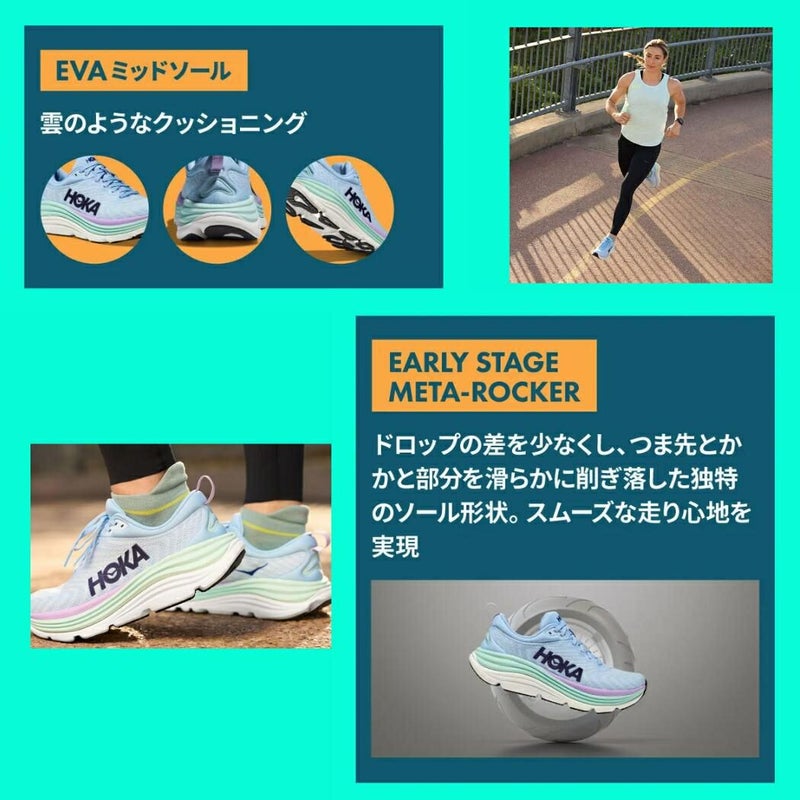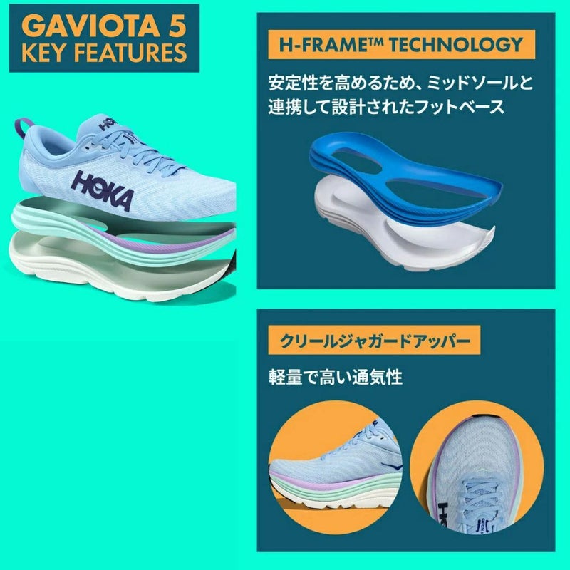 クッション性と安定性を両立させる新しいH-Frameや、通気性の良いクリールジャカードアッパーを搭載。BONDIのようなクッション性にH-Frameの安定性を融合させることで、HOKA独特の履き心地を実現しました。