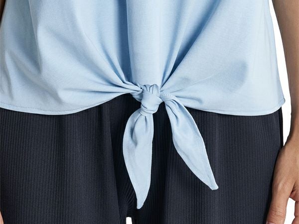 身幅広めのシルエットと、フロントの前結びデザインがキュートなトップス。