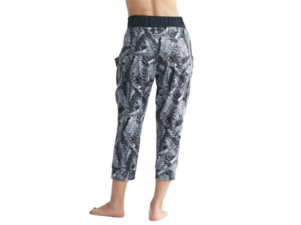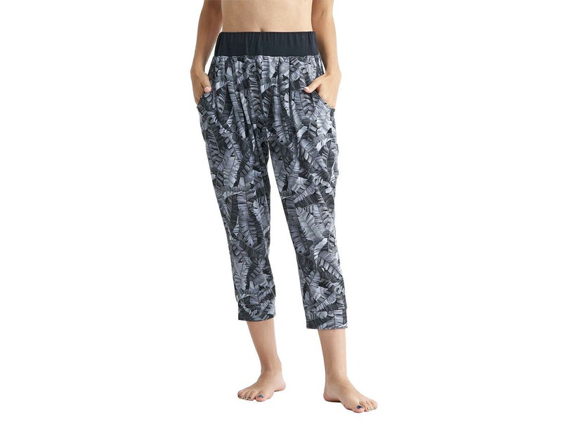 薄手素材でゆるっとしたシルエットの膝下丈のヨガパンツ。