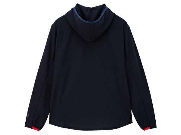 シンプルなアイテムですがフード先と袖口の配色パイピングが存在感のある1枚。