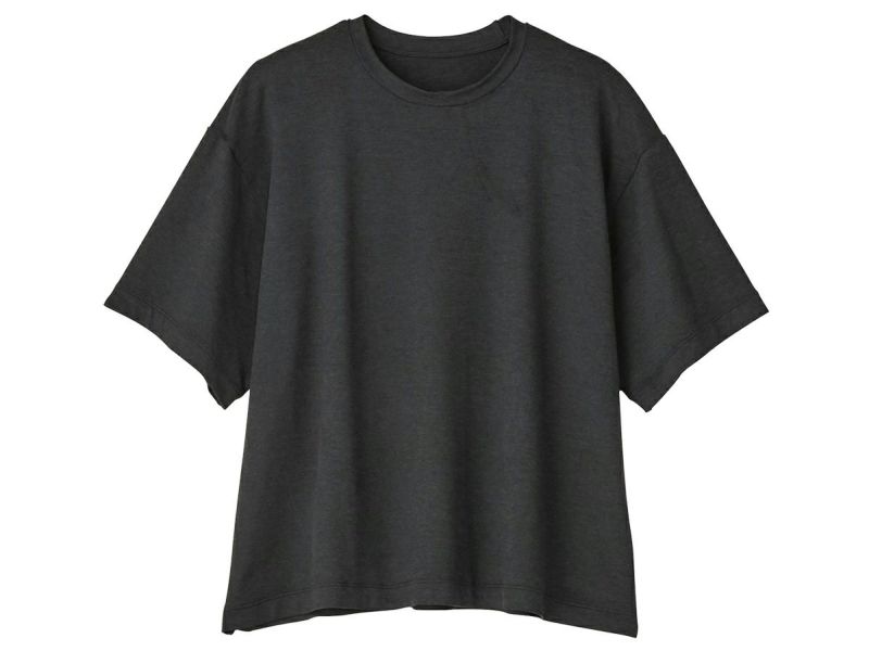 ゆとりのある身幅でも動いてズレないよう衿ぐりは狭く、丈は短めの