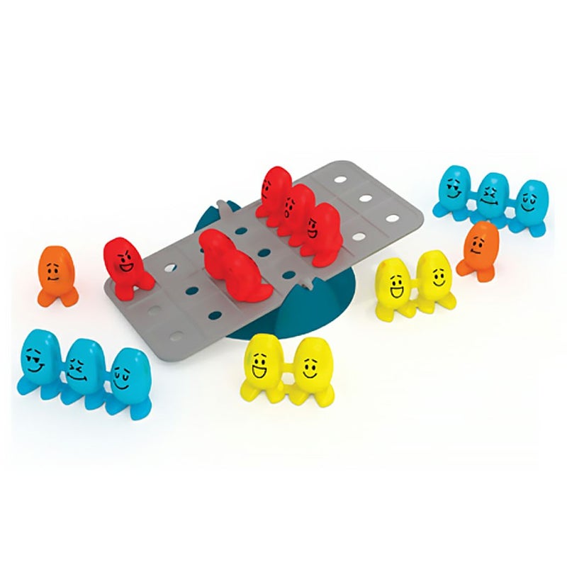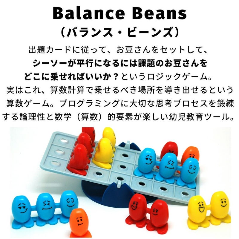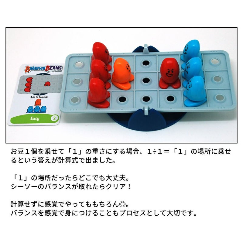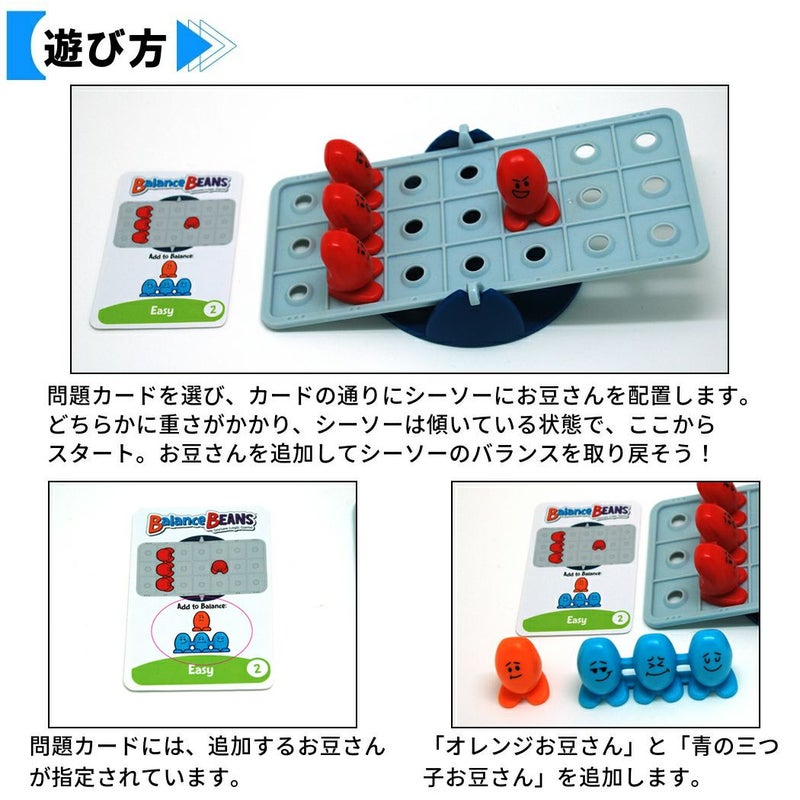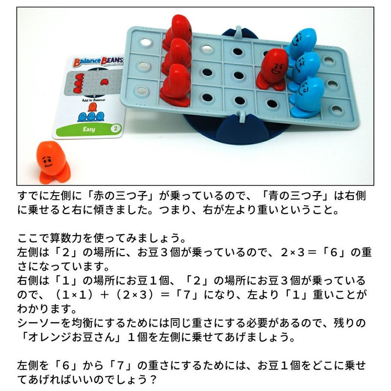 内容:シーソー1台、問題カード40枚、赤豆(1粒)1個、赤豆(2粒)1個、赤豆(3粒)1個、オレンジ豆(1粒)2個、黄豆(2粒)2個、青豆(3粒)2個