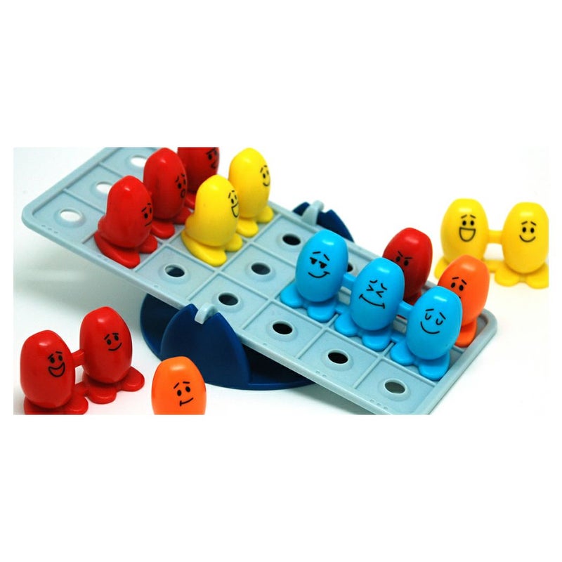 すでに左側に「赤の三つ子」が乗っているので、「青の三つ子」は右側に乗せると右に傾きました。