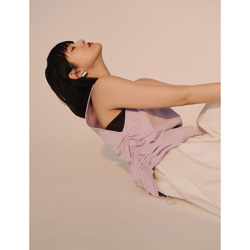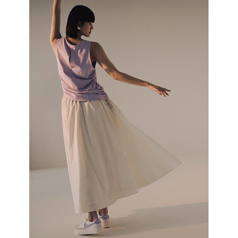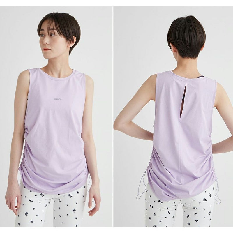 両脇のドロストデザインが特徴のタンクトップ。