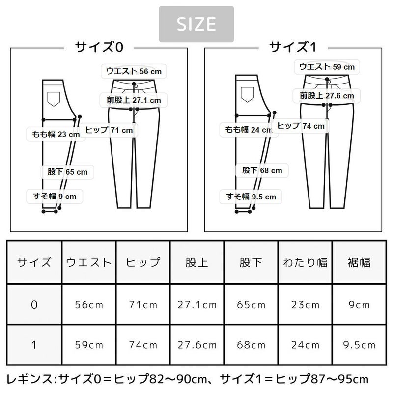 レギンス:サイズ0=ヒップ82-90cm、サイズ1=ヒップ87-95cm