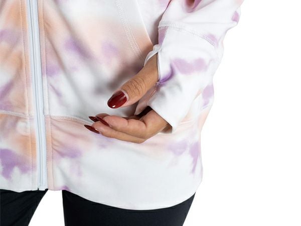 ZIPパーカータイプで、目を惹くタイダイプリントのデザイン。