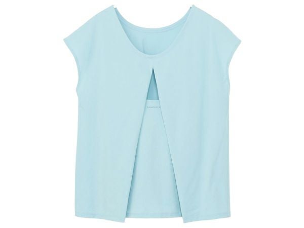 【10%OFF】スポーツ フィットネス ウェア ダンスキン DANSKIN バックオープンフレンチティー レディース 春 夏 ブルー 青 スポーツ フィットネス 半袖 Tシャツ DC724116-MI