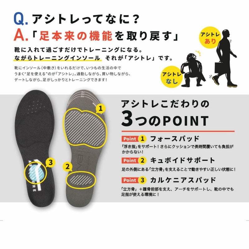 靴にインソールを入れるだけで、いつもの生活の中でうまく「足を使える」のがアシトレ。