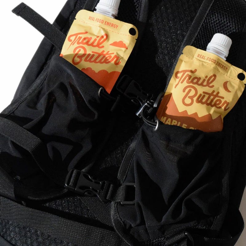 ショルダーのハーネスにはストレッチメッシュ素材のポケットが付属しており、