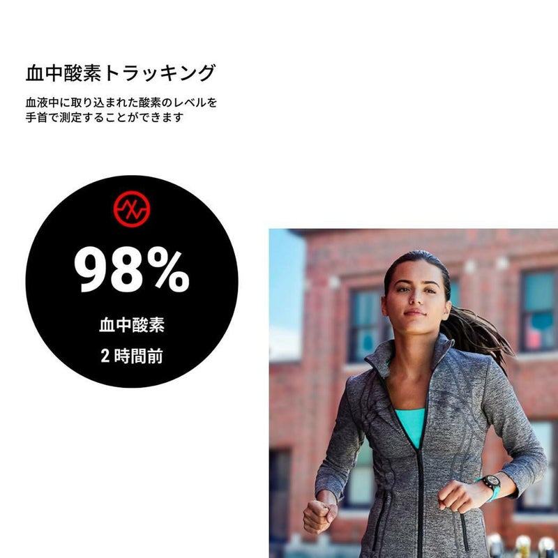 ※Garmin製品の血中酸素トラッキングによる測定は、医療目的で使用されることを意図するものではなく、あくまで一般的なフィットネスとウェルネスの範囲で利用することを目的とするものです。本機能は自己診断又は医師への相談をはじめとする医学的な使用を意図するものではなく、疾病の治療、診断、予防を目的とした医療機器ではありません。 商品の文字盤の表示は、実際の商品とは異なる場合があります。