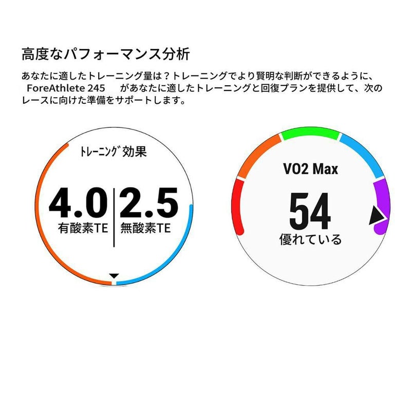ForeAthlete 245 があなたに適したトレーニングと回復プランを提供して、次のレースに向けた準備をサポートします。VO2 maxが高いほど、パフォーマンスの向上が期待でき、パフォーマンスコンディション測定基準にこの数値が表示されます。トレーニングステータスは、最近のエクササイズ履歴とパフォーマンス指標を自動的に評価して、生産的にトレーニングしているか、ピークに達しているか、あるいは過剰にトレーニングしていないかを知らせます。有酸素および無酸素トレーニングの効果に関するフィードバックから、ワークアウトが持久力やスピード、体力にどのような影響を与えているか確認できます。リカバリータイムは、次回の過酷なチャレンジへの準備が整うタイミングを予測することで、トレーニングから得られるメリットを最大限に高めるために役立ちます。全体的なトレーニング負荷を確認することもできます。トレーニング負荷では、過去7日間の運動量が測定され、あなたのフィットネスの最適な範囲や最近のトレーニング履歴と比較されます。